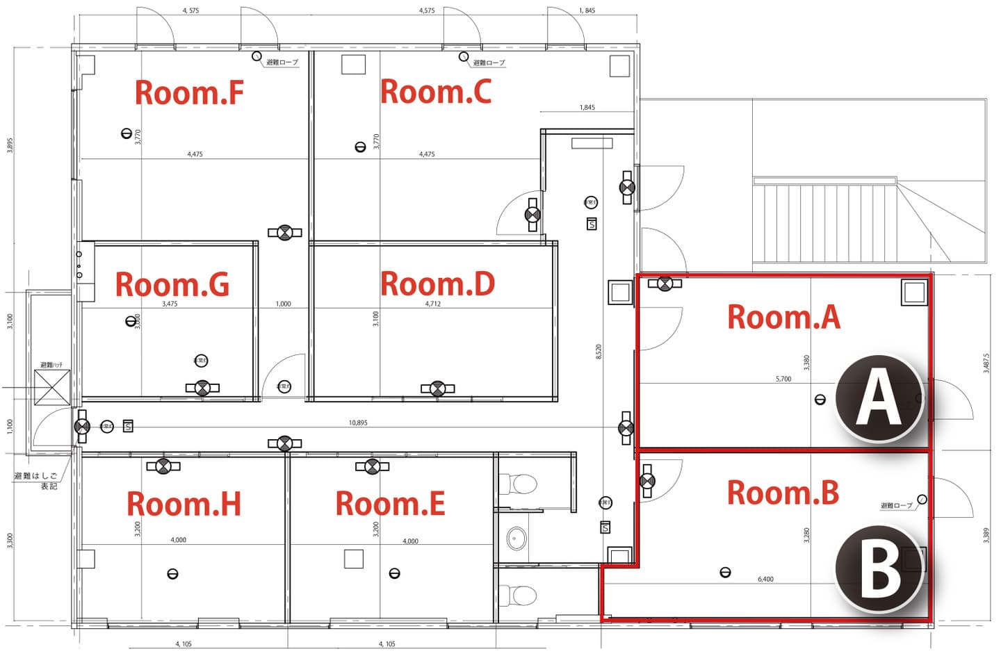 ●号室:A号室、B号室